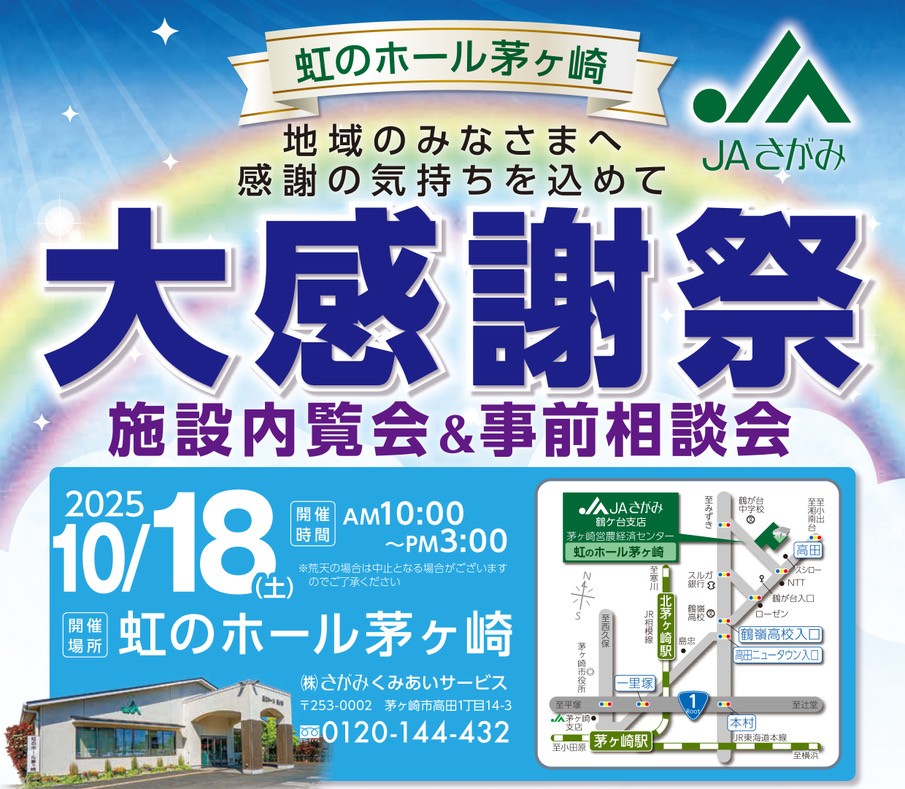 午前10時~午後3時、虹のホール茅ケ崎にて大感謝祭を開催いたします。