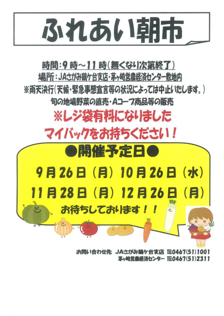 【開催日】 令和4年10月26日(水) 【時間】 9時~11時(無くなり次第終了) 【場所】 JAさがみ鶴ケ台支店・茅ヶ崎営農経済センター敷地内 【内容】 旬の地場野菜の直売・Aコープ商品等の販売 【ご案内】 ■雨天決行(天候・緊急事態宣言等の状況によっては中止いたします) ■レジ袋は有料です。マイバックをお持ちください! 【問い合わせ先】 ■鶴ケ台支店 0467-51-1001 ■茅ヶ崎営農経済センター 0467-51-2311