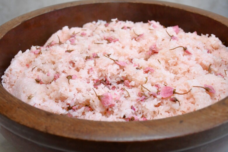 ★桜の風味や色を楽しむために、桜の塩漬けともち米は一緒に炊いていません。
