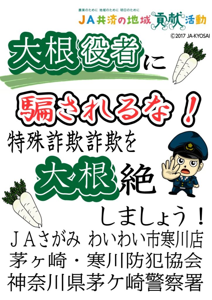 当店では来る2月17日月曜日に『大根で大根絶!特殊詐欺撲滅イベント』を開催します。このイベントは当店における地域貢献の一環として、茅ヶ崎警察署と合同で開店から店頭で特殊詐欺撲滅を訴えます。当日は『大根で大根絶』の名前の通り、特殊詐欺への注意喚起をしながら地元産大根を配布して、特殊詐欺″大根“絶を訴えるイベントとなります!配布する大根の数は限りがありますので、お早めにご来店下さい。