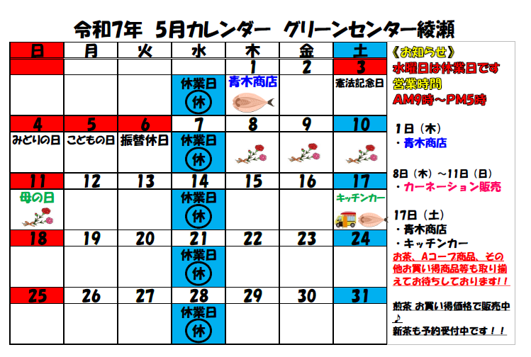【グリーンセンター綾瀬】5月出店カレンダー