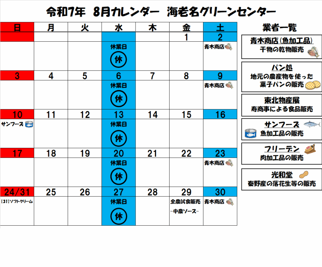 📅8月出店カレンダー📅【海老名グリーンセンター】