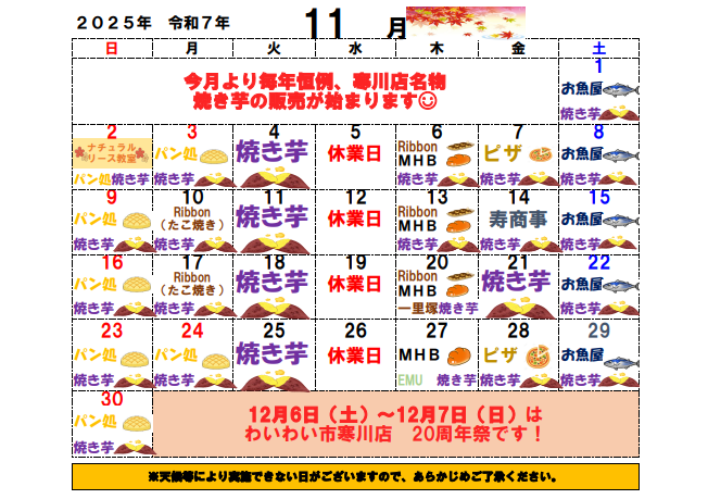 12月にはわいわい市寒川店20周年祭があります!!!改めて告知いたしますのでご確認くださいね♬