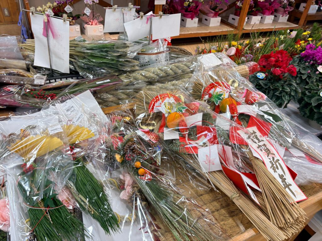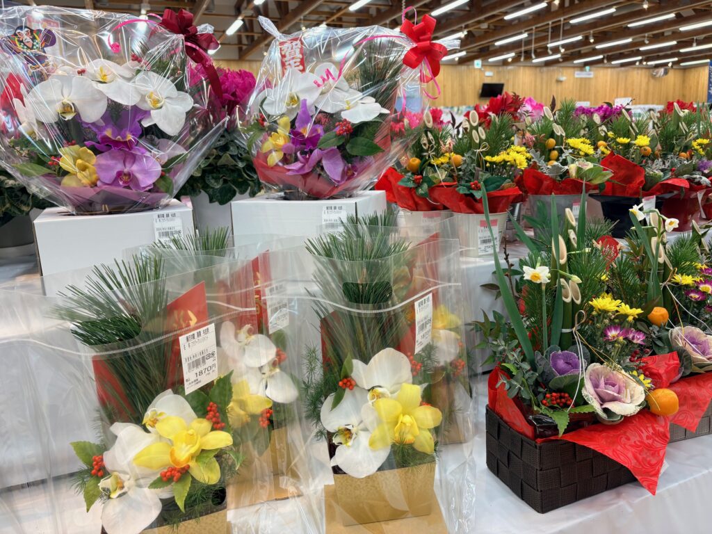 わいわい市藤沢店には、「お正月花」「お正月飾り」がたくさん並んでいますよ。