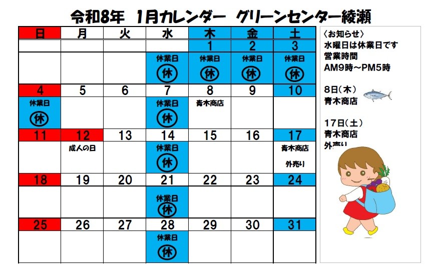 【グリーンセンター綾瀬】1月出店カレンダー
