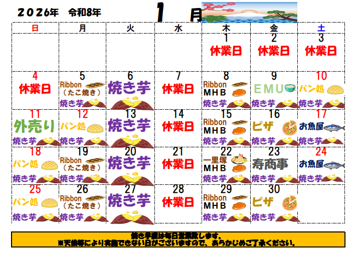 1月出店カレンダー 一部変更【わいわい市寒川店】