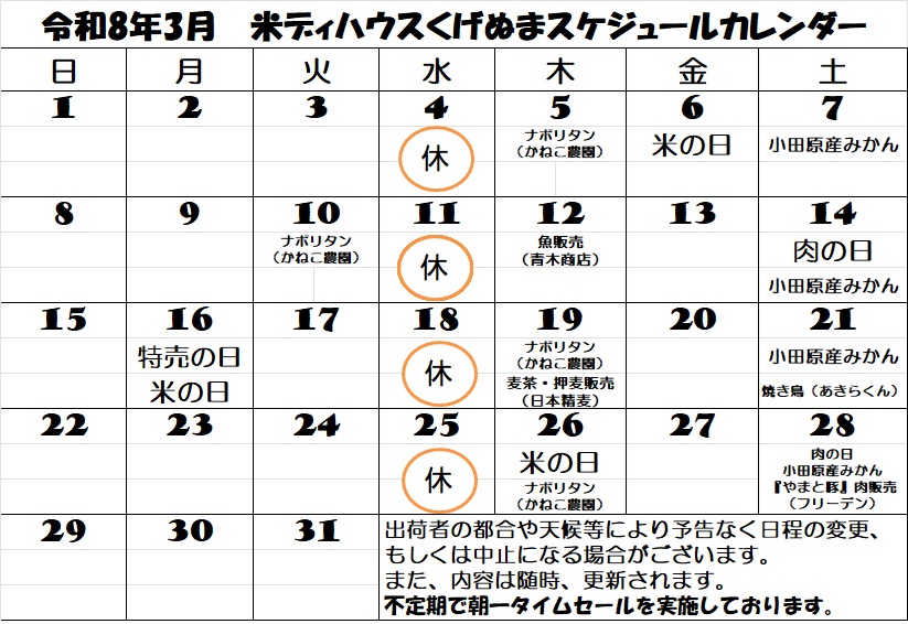 米ディハウスくげぬまイベントカレンダー(3月分)