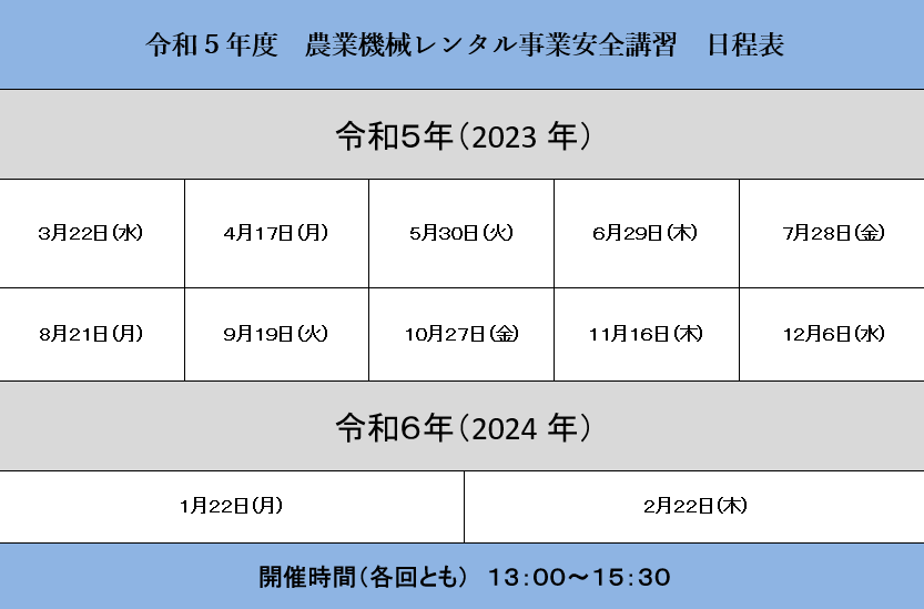 なお、農業機械レンタル事業の利用には講習会の受講が必須です。日程などくわしくは下記をご確認下さい。