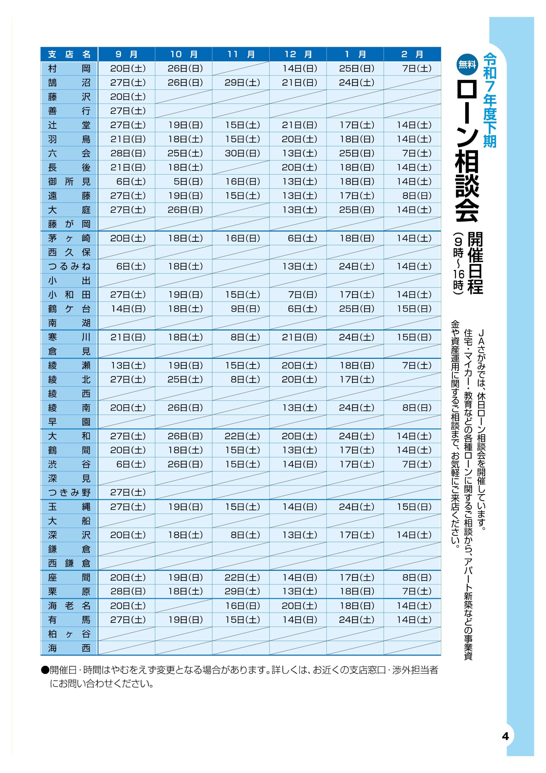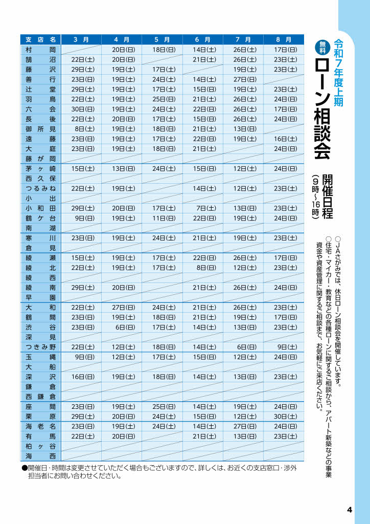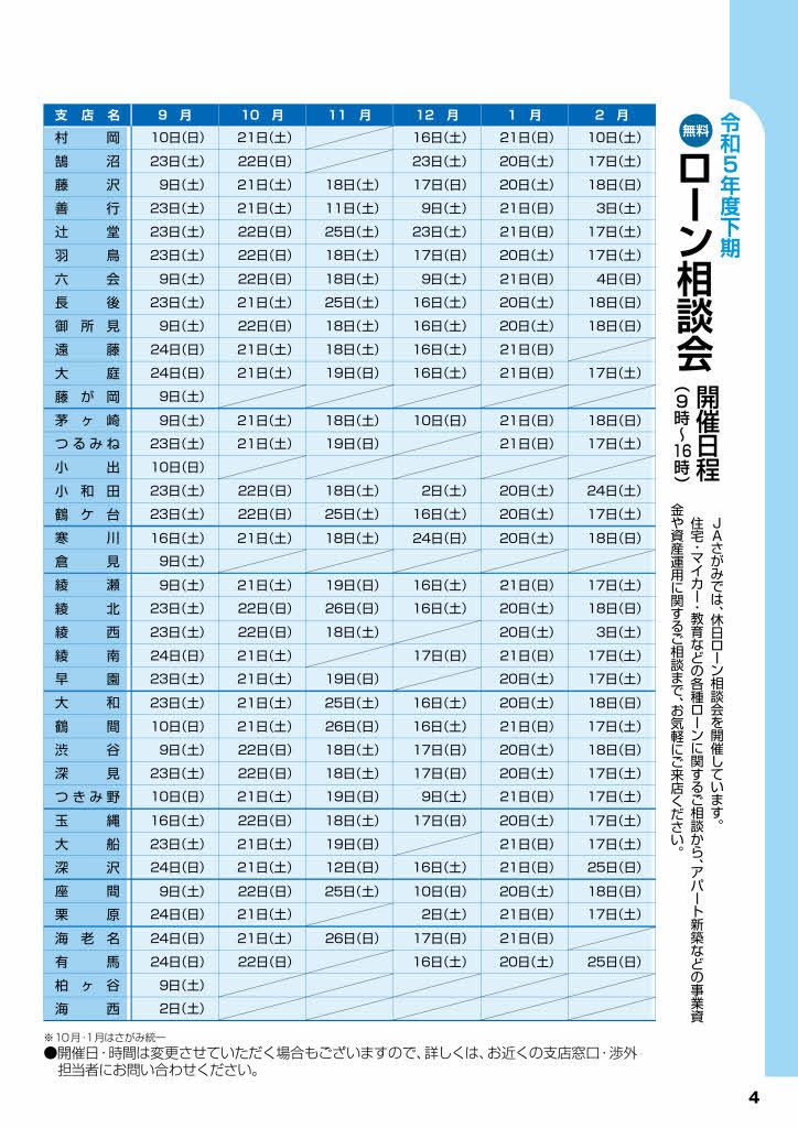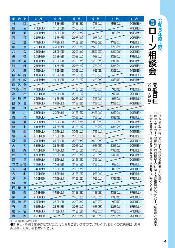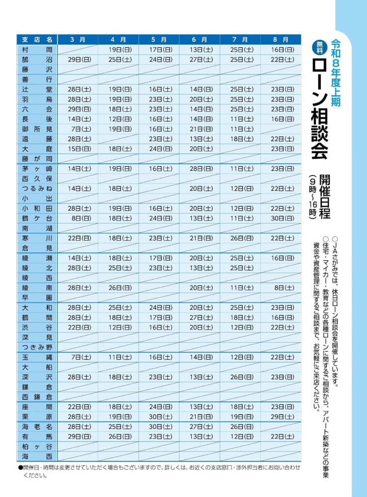 JAさがみでは、休日にゆっくりと住宅ローンなどのご相談をいただけるよう、各会場にて「ローン相談会」を開催しています。新築やリフォーム、住宅ローンの借換えをはじめ、マイカーの購入や車検の費用、お子様の教育資金などのご相談にお答えいたします。